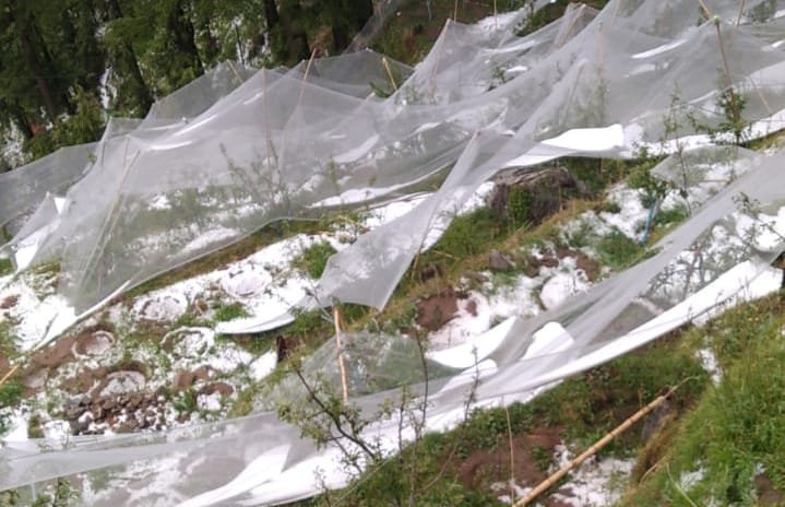 हिमाचल रेडर न्यूज नेटवर्क। हिमाचल में अप्रैल में बदले मौसम ने सबको हैरान परेशान कर दिया है। मौसम विभाग के येलो अलर्ट के बीच हिमाचल प्रदेश के कई भागों में बारिश और ओलावृष्टि हुई है। कुल्लू जिले में कई इलाकों में ओलावृष्टि से सेब और मटर को काफी नुकसान हुआ है। ओलावृष्टि से सेब के बगीचों में लगाई गई एंटी हेलनेट भी टूट गई।
